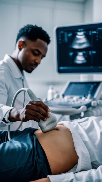 Gel applied; transducer moved over the abdomen.